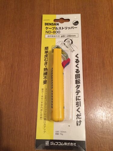 これは一本持っておきたい工具ですね。 計装工事だと必須使用工具。 パッケージに書いてある通り、くるくる回してタテに引くだけです。 線の種類や太さによって、↓の赤いダイヤルを調整します。 この中に替え刃も収納されています。 これがあるのとないので…